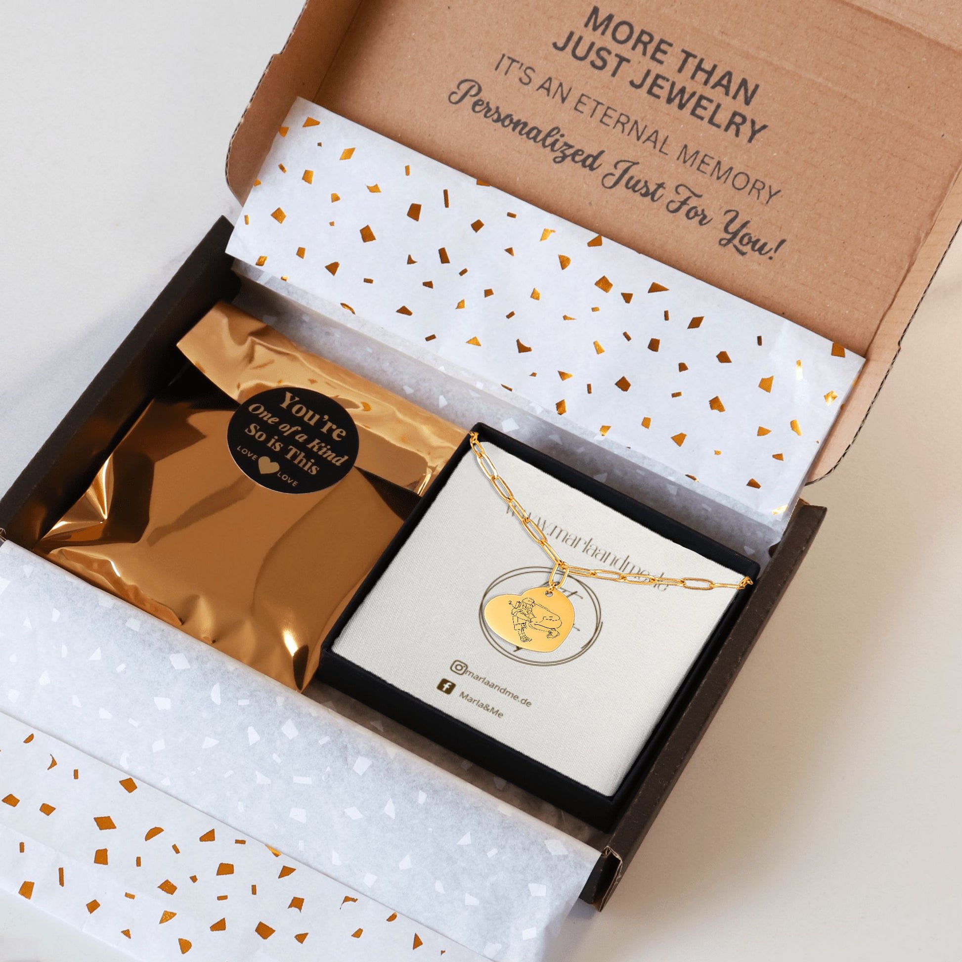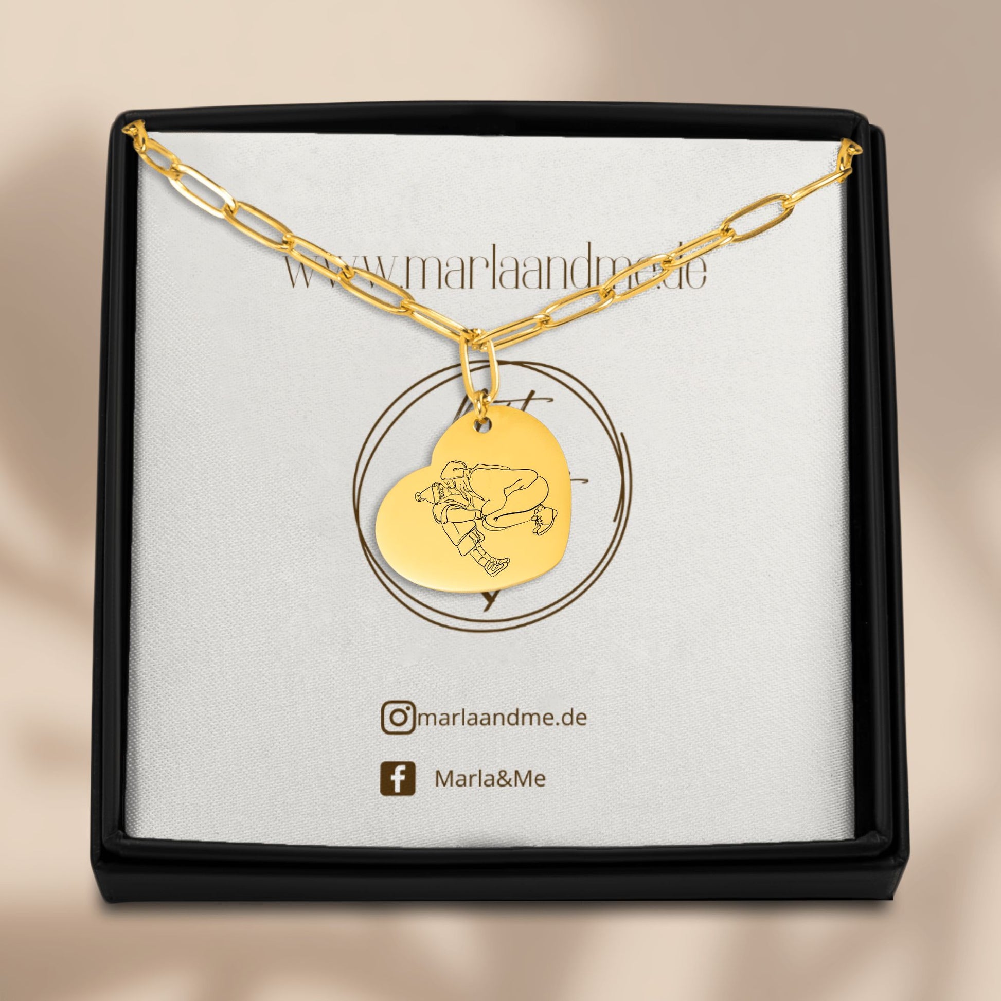 Manche Momente verdienen es, für immer bewahrt zu werden – und genau das macht unsere personalisierte Herzkette mit Line-Art-Gravur möglich. Dein Lieblingsfoto wird in eine kunstvolle feine Linienzeichnung (Line Art) verwandelt und liebevoll auf den Herz-Anhänger graviert. Ob ein inniges Portrait, dein Haustier oder ein besonderes Symbol – du entscheidest, welche Erinnerung du nah bei dir trägst.